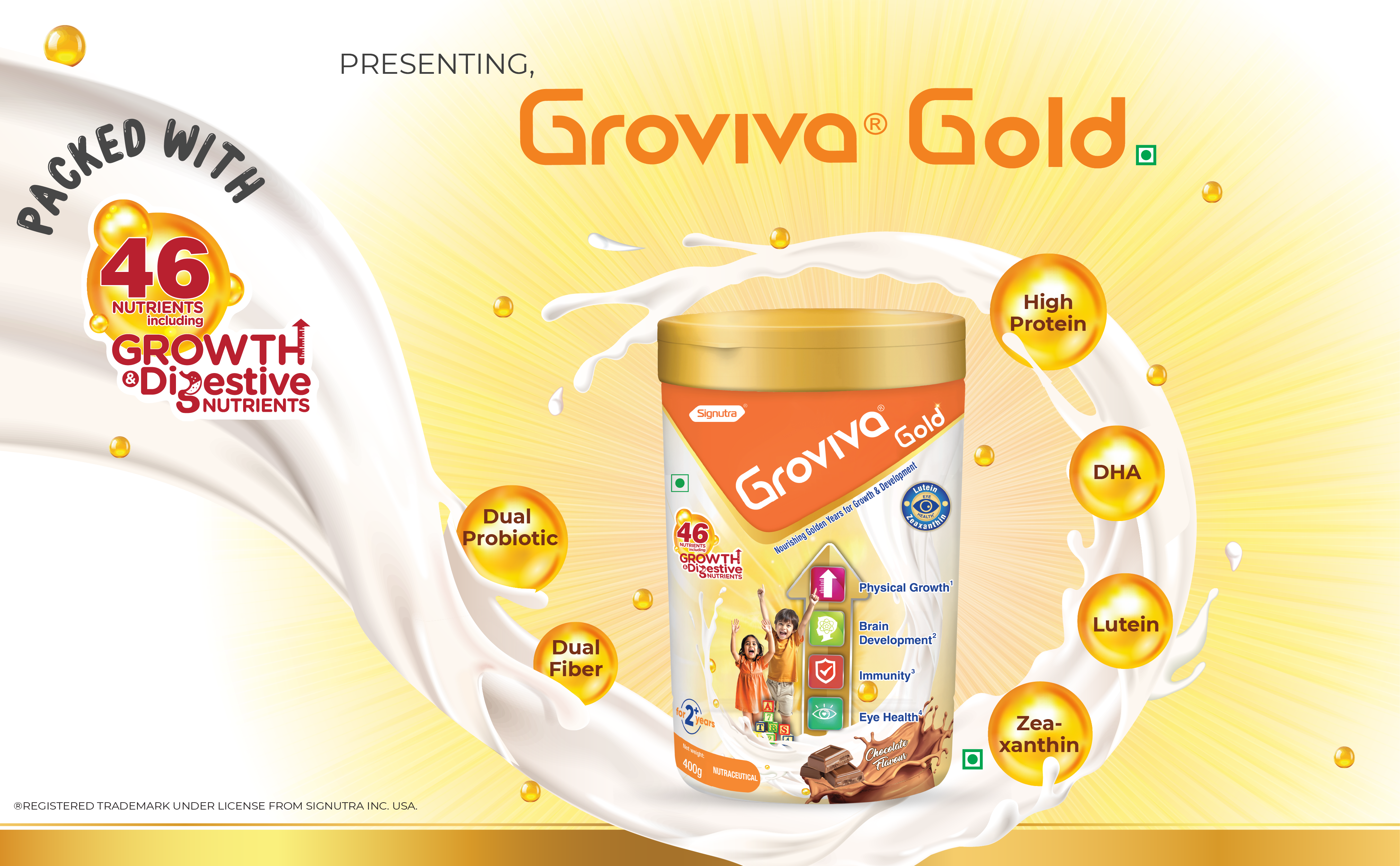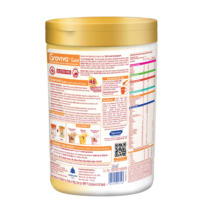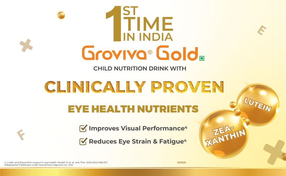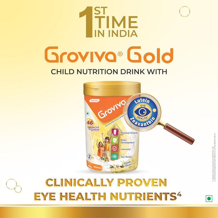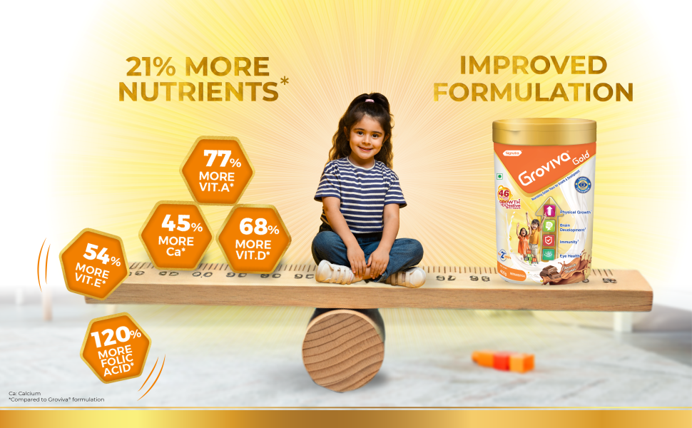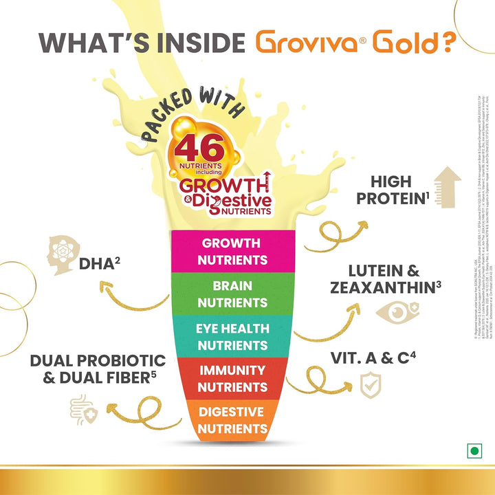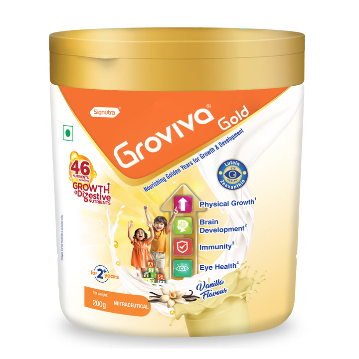 Groviva Gold contains 46 vital nutrients & is power packed with the Unique combination of Maximum Growth & Digestive nutrients, which not only support Physical Growth but also helps in Brain Development, Immunity & addresses the critical issue of Eye Health in today’s growing children.