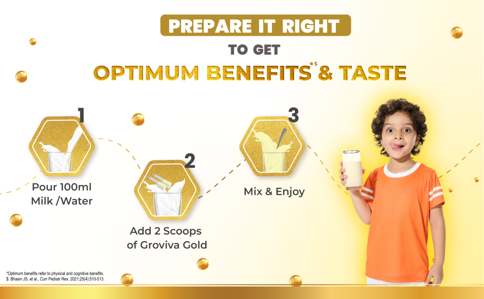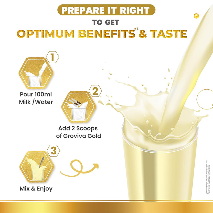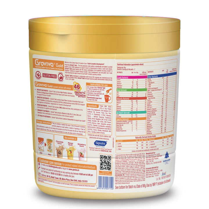 Groviva Gold Milk Protein Powder for Kids | 2-6 Years | 46 Nutrients | Growth & Digestive Nutrients | Supports Physical Growth, Brain Development, Immunity & Eye Health
