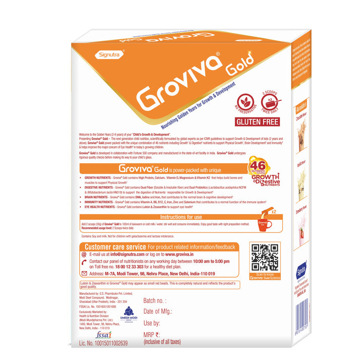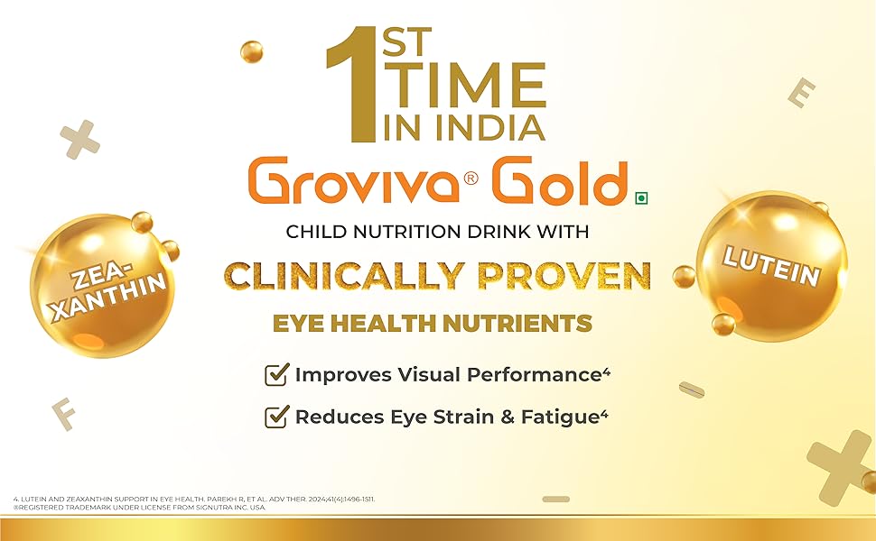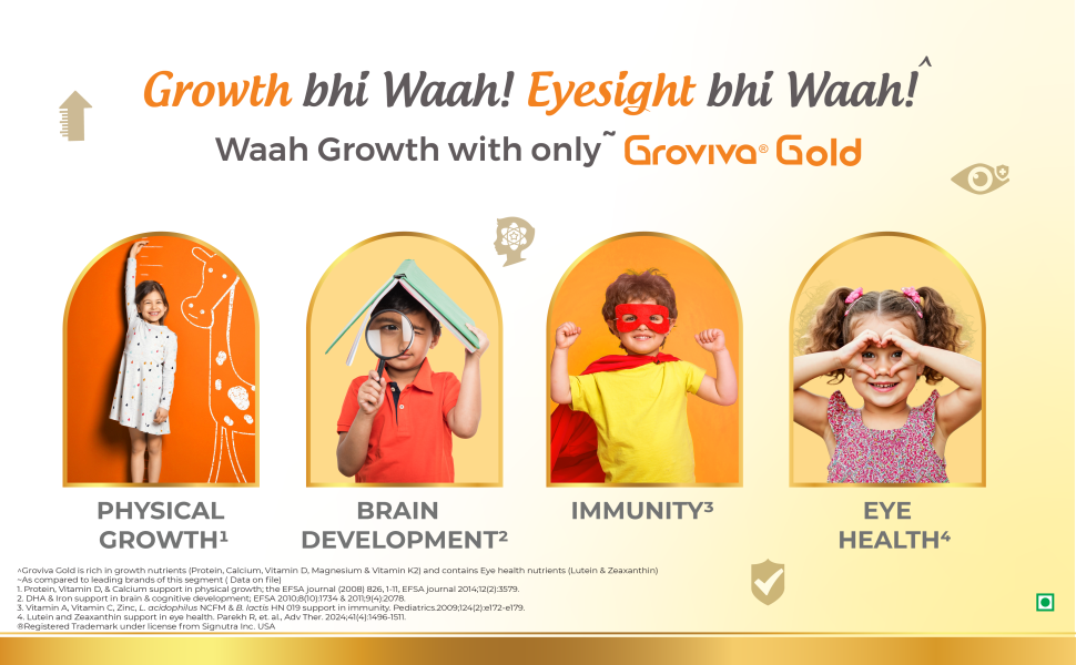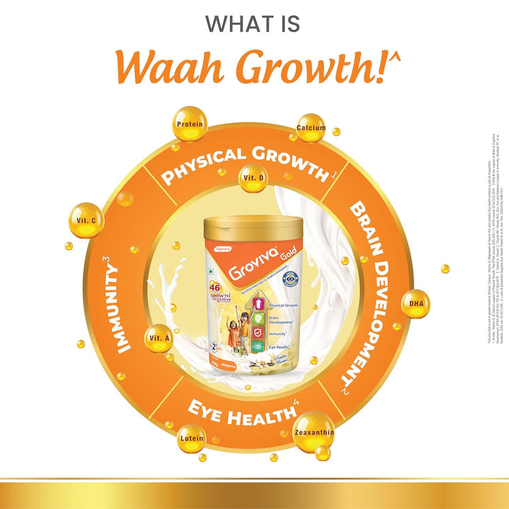 Groviva Gold contains 46 vital nutrients & is power packed with the Unique combination of Maximum Growth & Digestive nutrients, which not only support Physical Growth but also helps in Brain Development, Immunity & addresses the critical issue of Eye Health in today’s growing children.