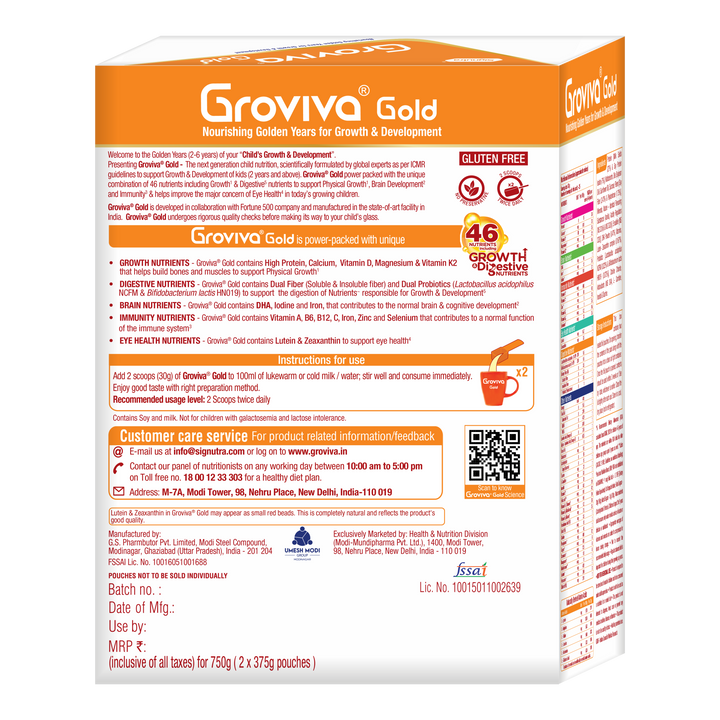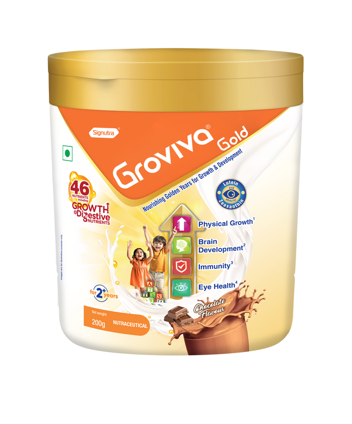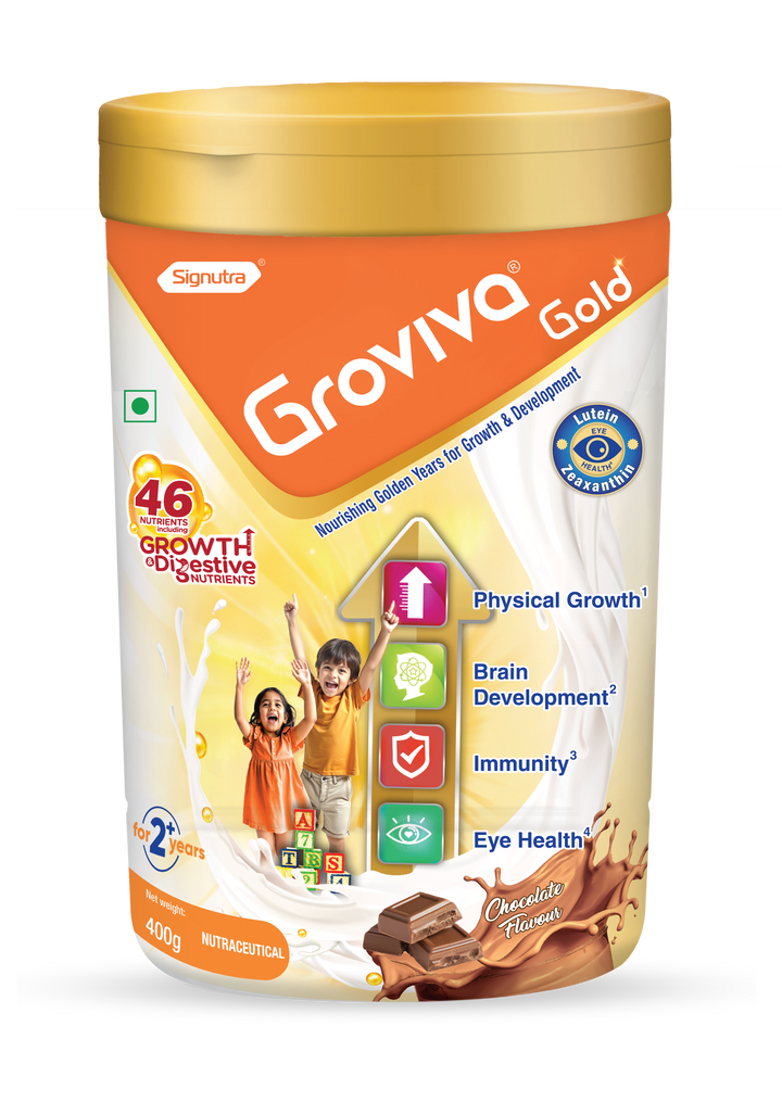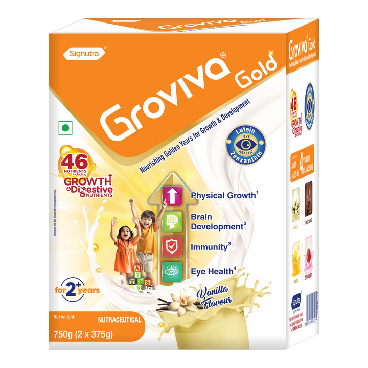 Groviva Gold contains 46 vital nutrients & is power packed with the Unique combination of Maximum Growth & Digestive nutrients, which not only support Physical Growth but also helps in Brain Development, Immunity & addresses the critical issue of Eye Health in today’s growing children.