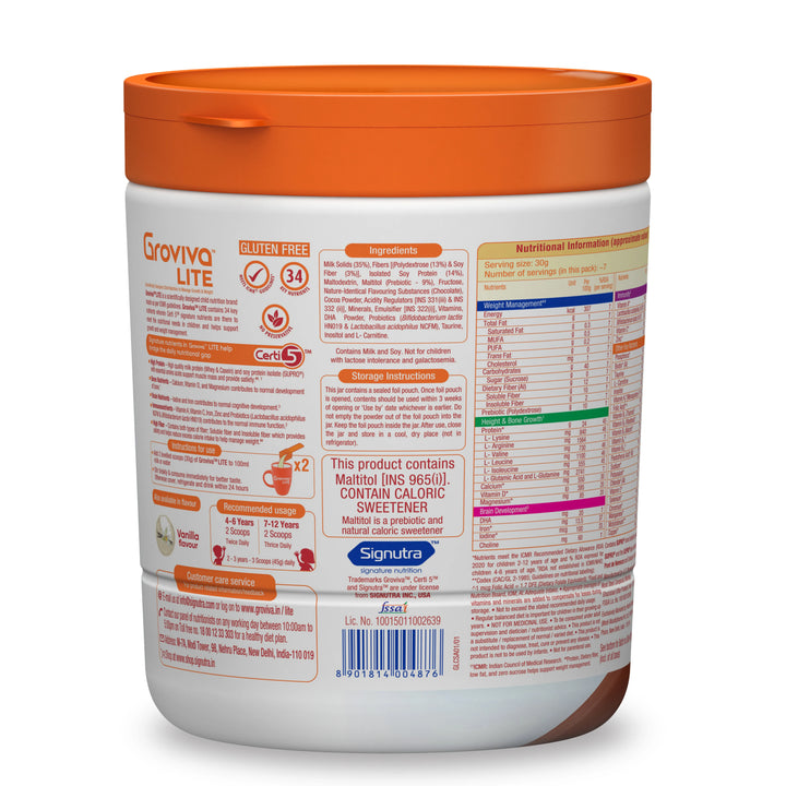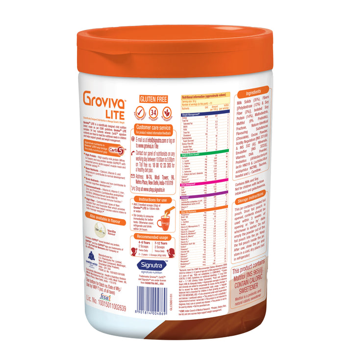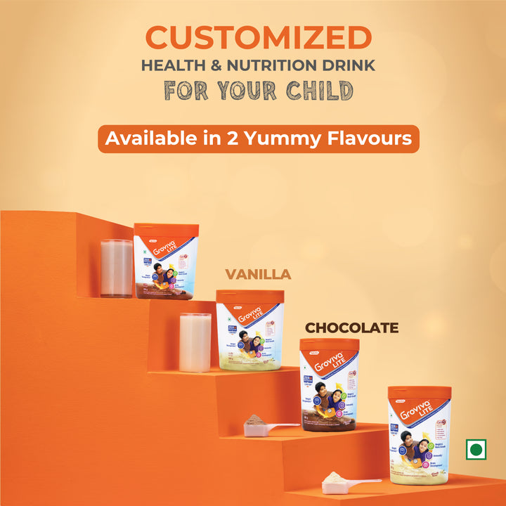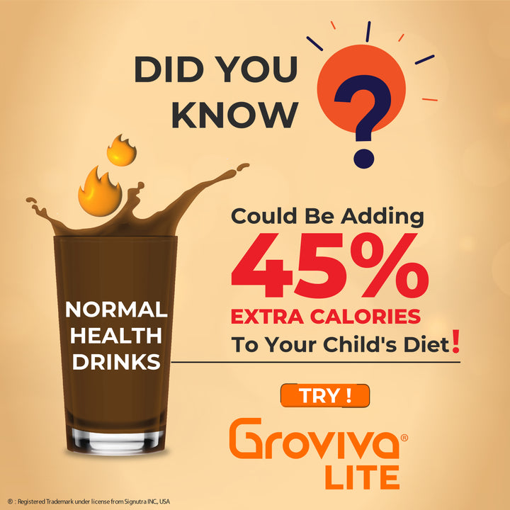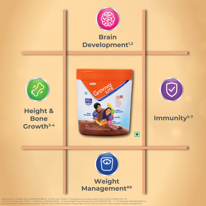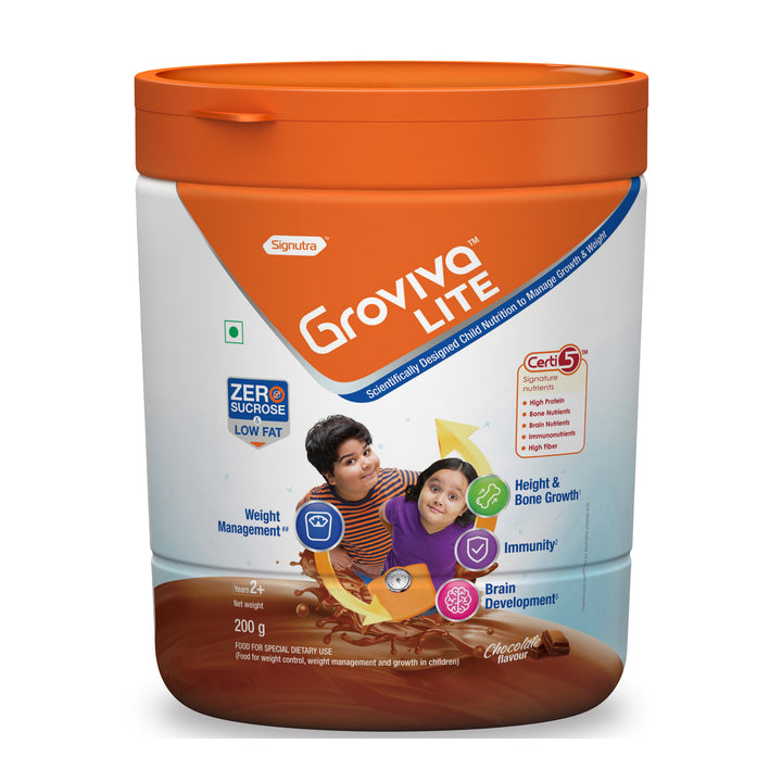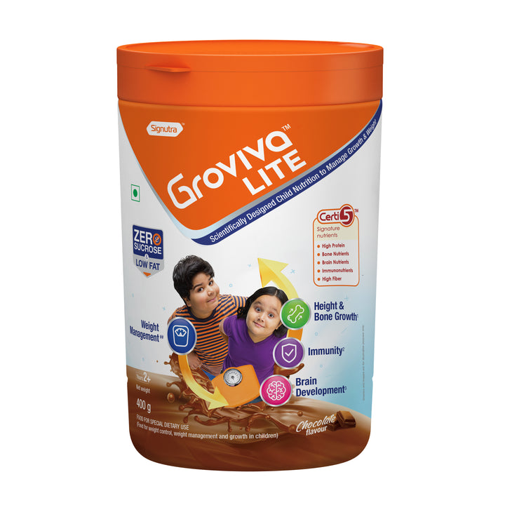 Groviva Lite is a scientifically designed child nutrition to manage your child's growth. It is packed with 34 vital nutrients and contains low fat. Groviva Lite follows ICMR guidelines.