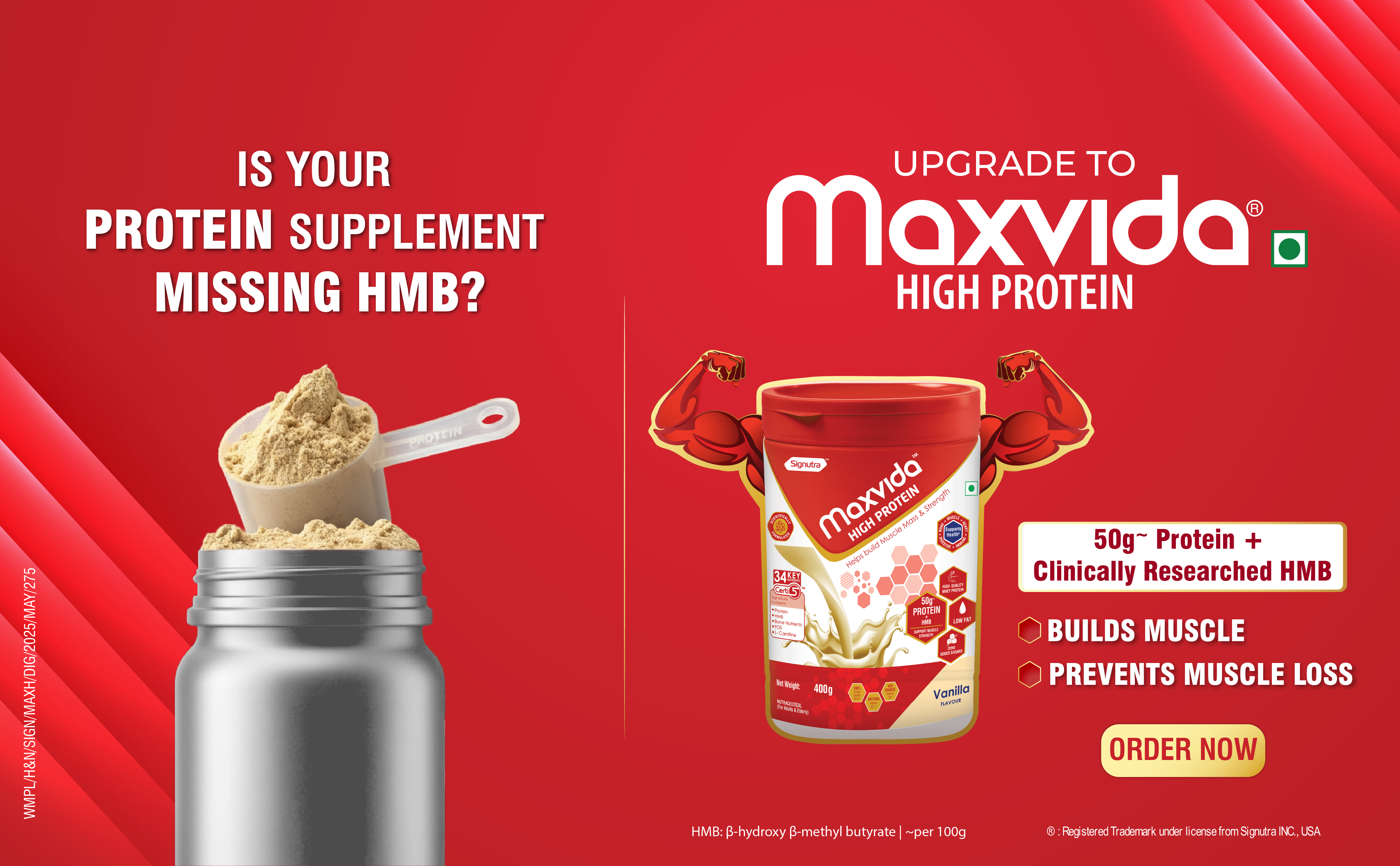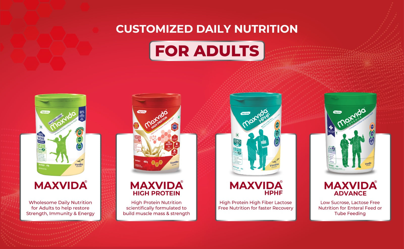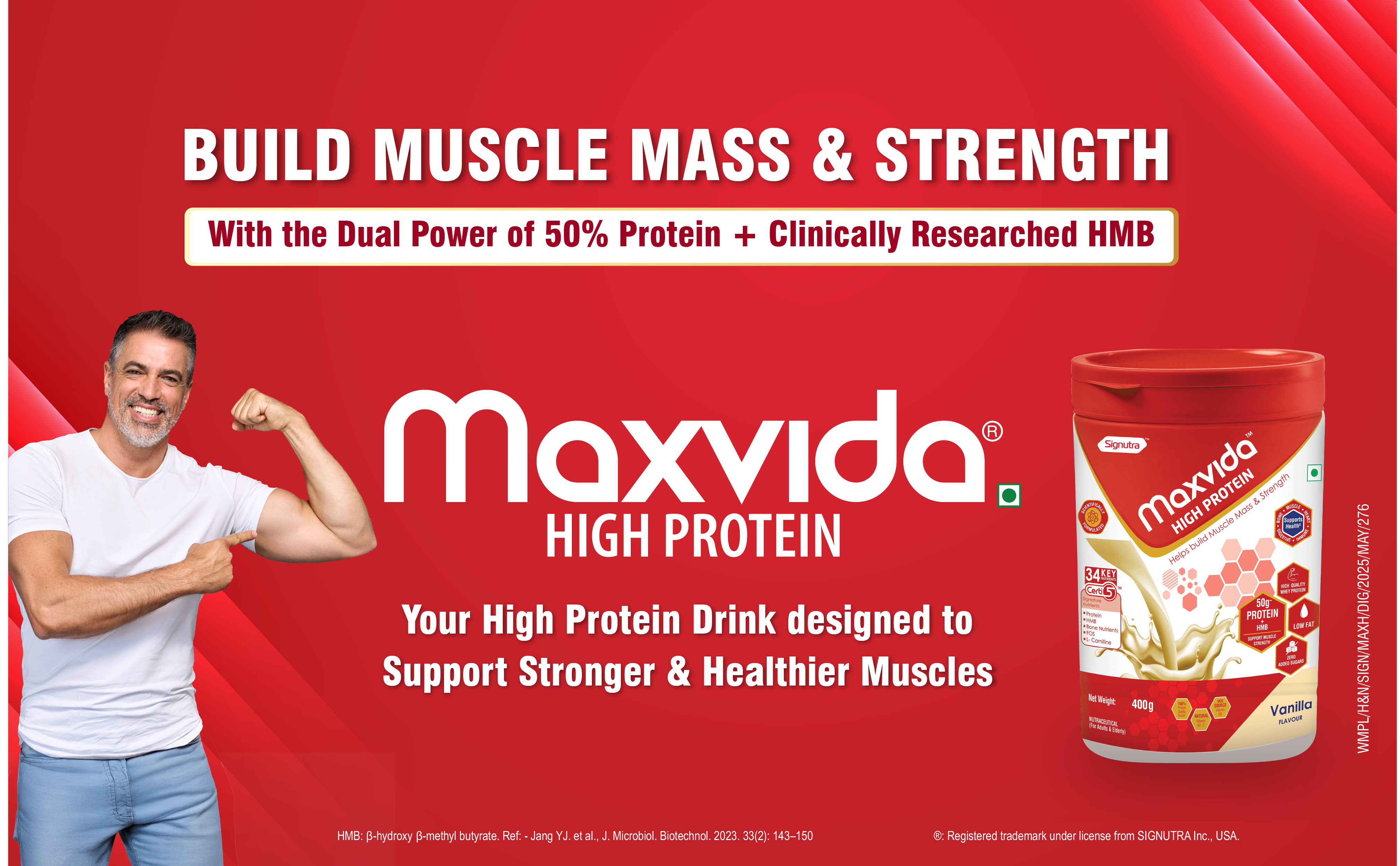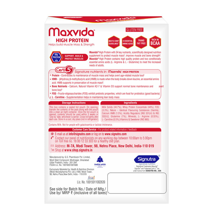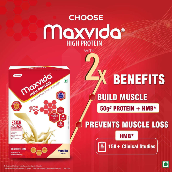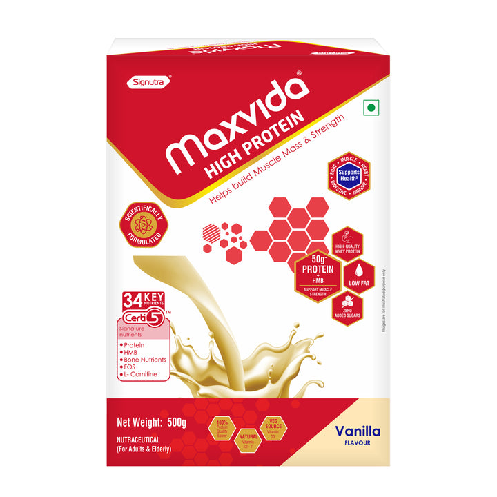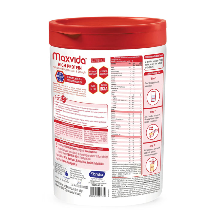 Maxvida High Protein is a scientifically designed nutrition supplement with 34 key nutrients. Packed with 50g high-quality protein, HMB, L-Arginine, L-Glutamine and BCAA, it helps support muscle mass, bone strength, and overall active living for adults.