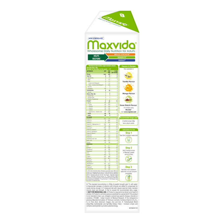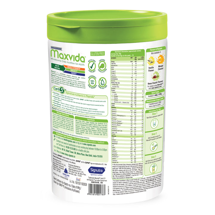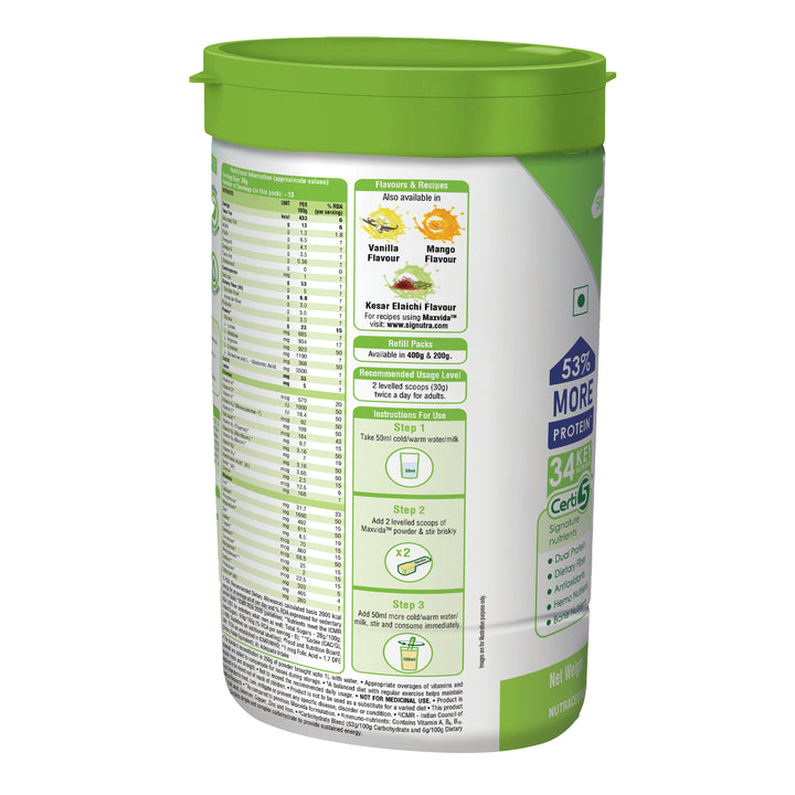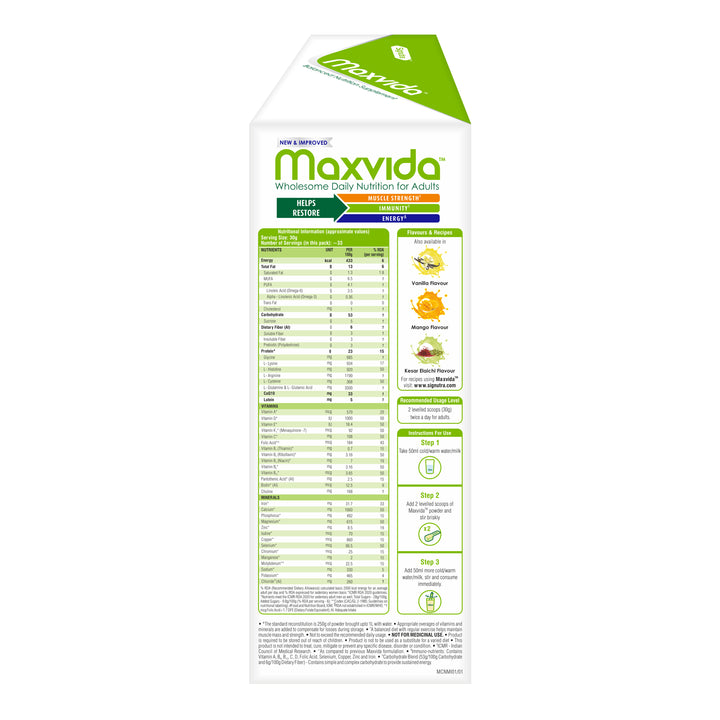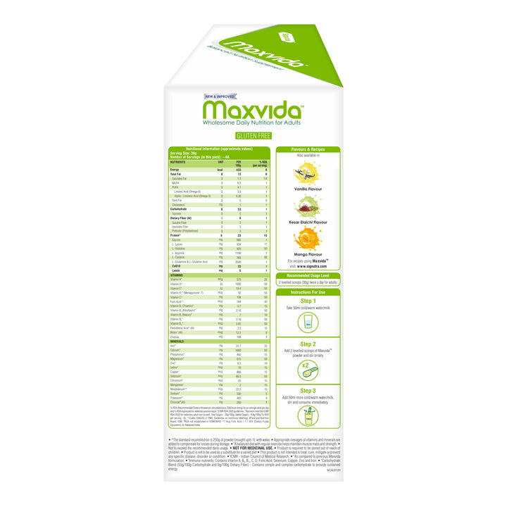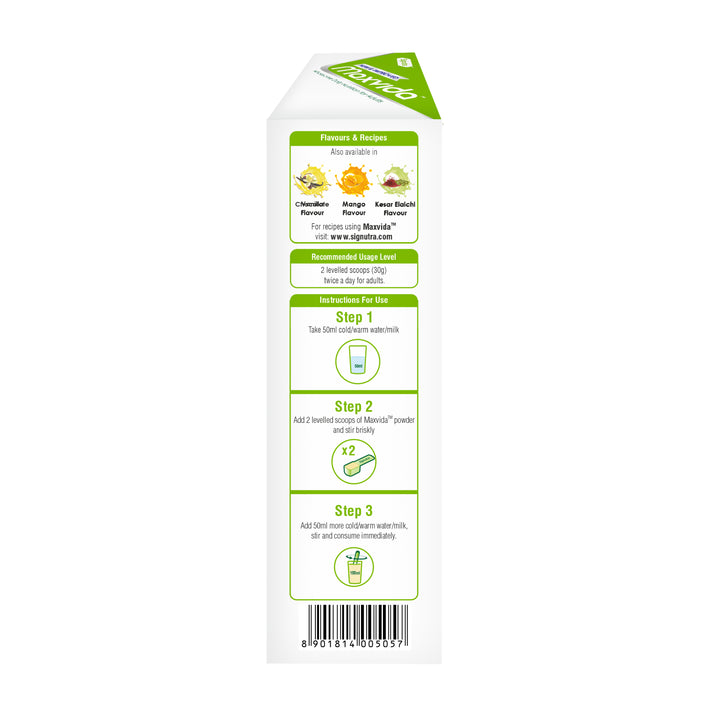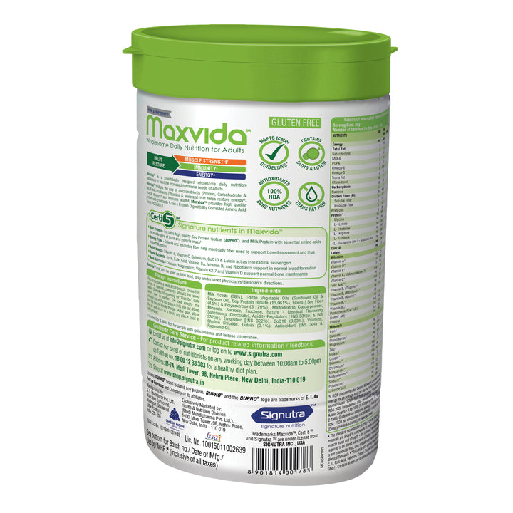 Maxvida is a scientifically designed nutrition that helps meet the increased daily needs of adults. Packed with high-quality protein, essential vitamins, and minerals, it helps boost energy, support muscle strength, and improve immunity. With an ideal PDCAAS score of 1, Maxvida offers easy digestion and absorption of proteins, and it tastes great too! This makes Maxvida a suitable nutrition supplement even for pregnancy.