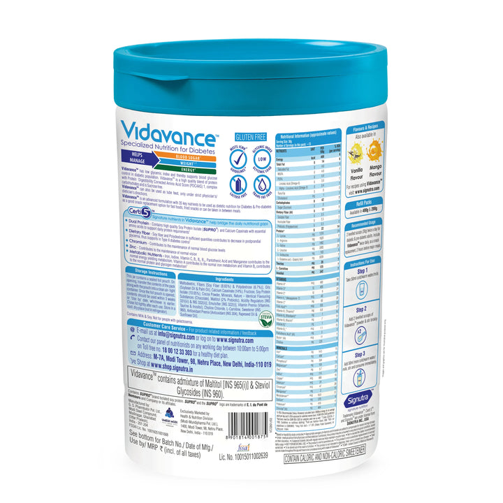 Vidavance is a low glycemic index nutrition supplement designed to help manage blood sugar levels in people with Diabetes and Pre-diabetes. It contains a high-quality protein blend (PDCAAS 1), complex carbohydrates, and 35 essential nutrients. Sucrose-free and suitable as a healthy snack replacement for fried or fast foods. Recognized as the No. 1 diabetic supplement, best among the top leading diabetic supplements by Consumer Voice. Clinically proven 1.5% HbA1c reduction in 6 months